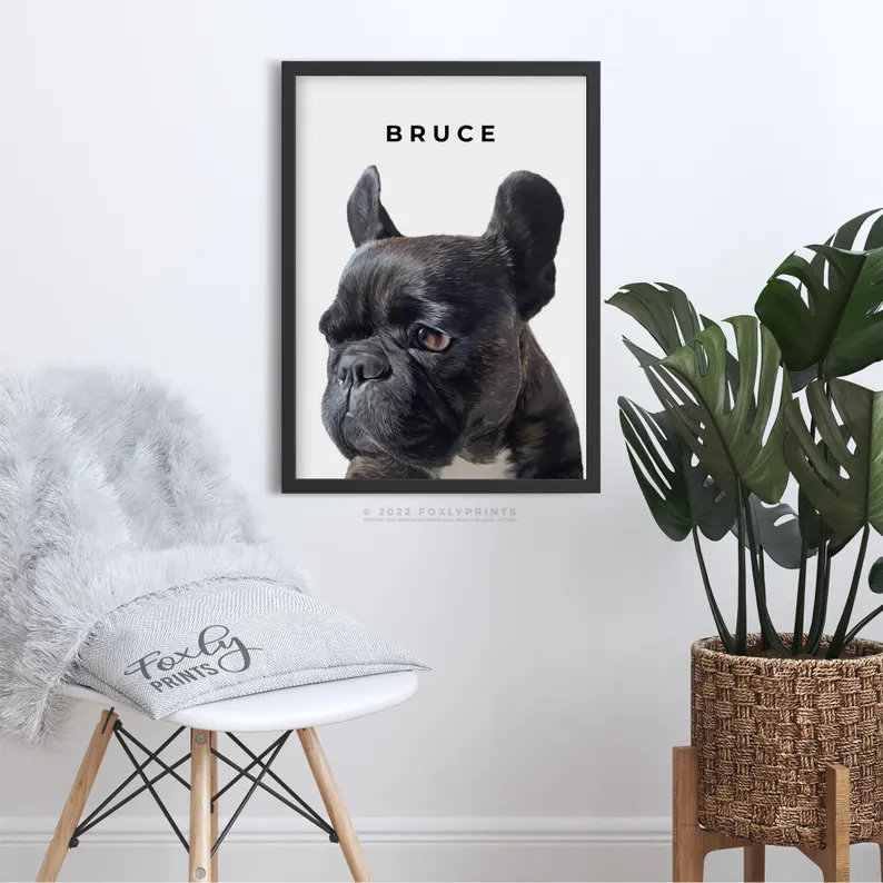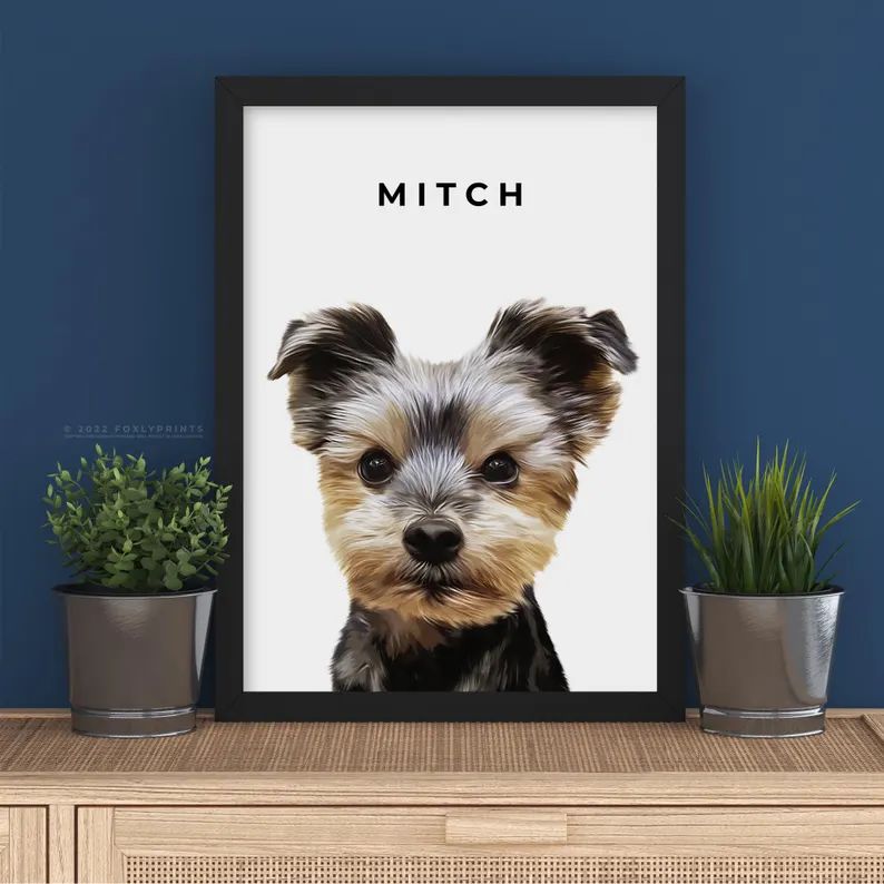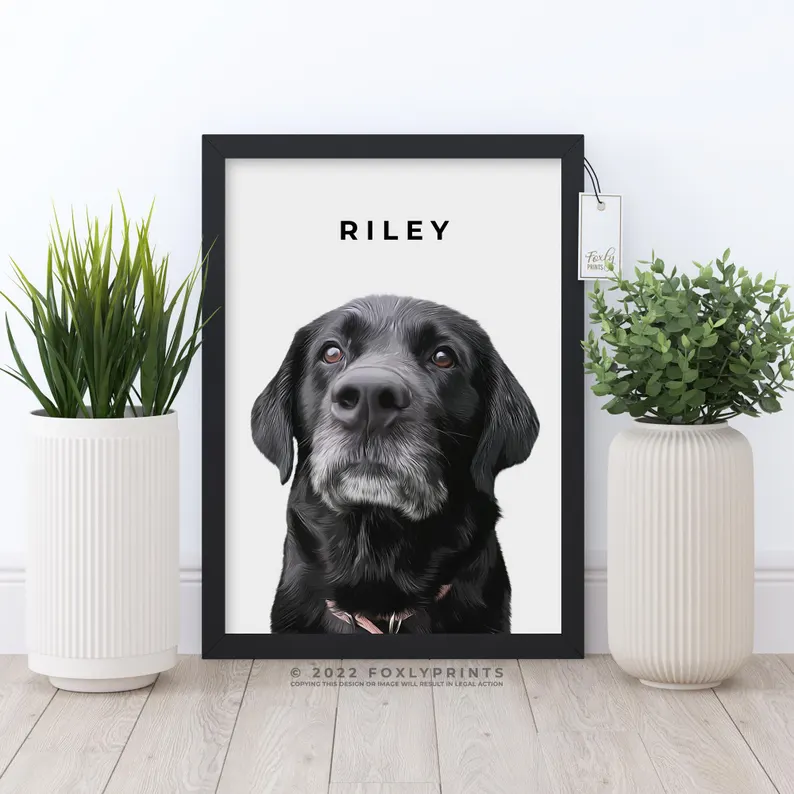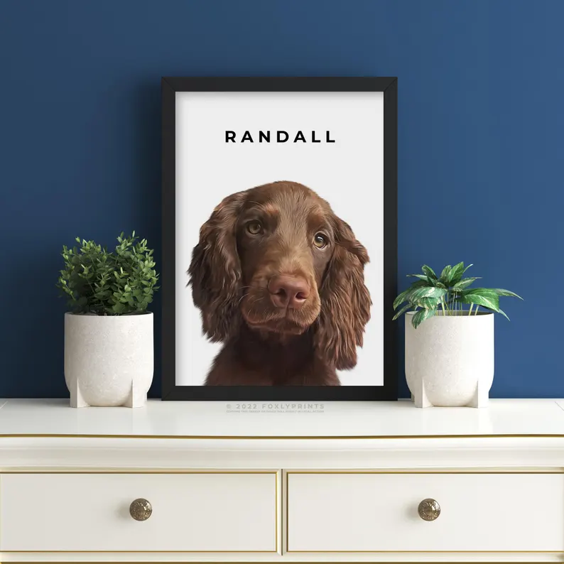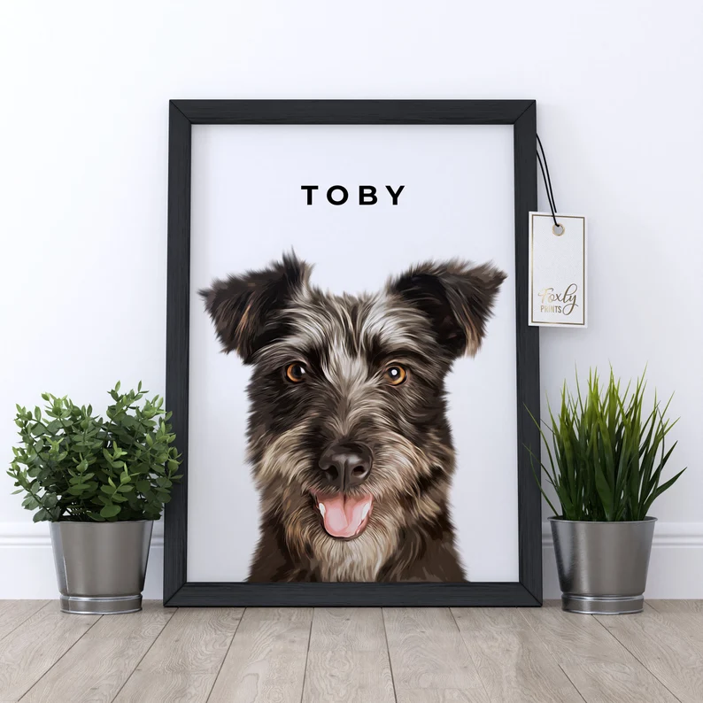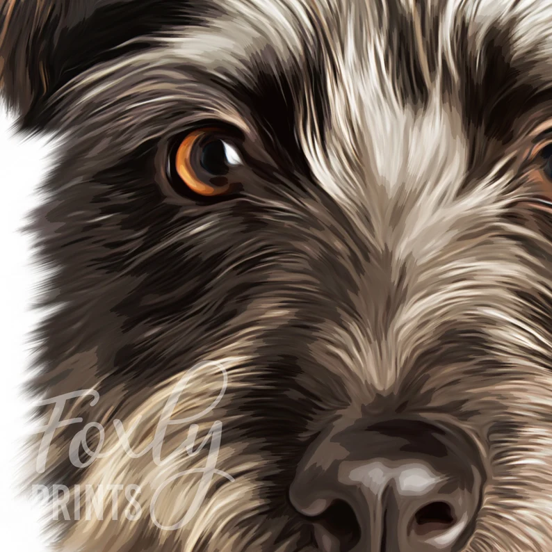 Portrait from photo, simply send in your photo and we will draw this beautiful modern portrait that will look great in any space in your home. Painted digitally using digital brushes to illustrate your dog. This is not a painting with traditional paints, it is painted on a computer and then we will send the digital file to print on anything you like using your own service, select your option and size from the dropdown box.